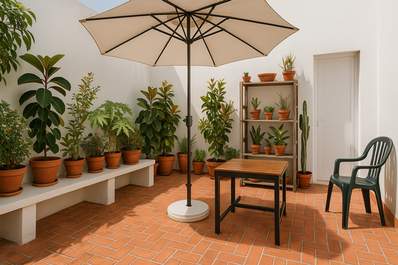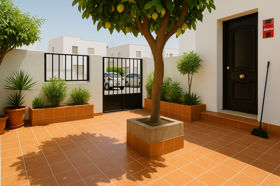 La vivienda cuenta con un amplio patio de entrada, enlosado en barro cocido y adornado con un frondoso limonero que da sombra natural y vida al espacio. Abierto a la calle y protegido por una verja metálica, este patio es perfecto para colocar plantas, disfrutar del buen clima o simplemente dar la bienvenida con un toque andaluz. Un espacio funcional y con encanto, ideal como antesala del hogar.