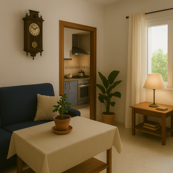 Gracias a la ventana lateral, esta estancia cuenta con buena luz natural durante el día. El espacio se completa con detalles decorativos como el reloj de pared antiguo, plantas y mobiliario sencillo, creando un ambiente cálido y funcional que comunica perfectamente las estancias principales de la planta baja.