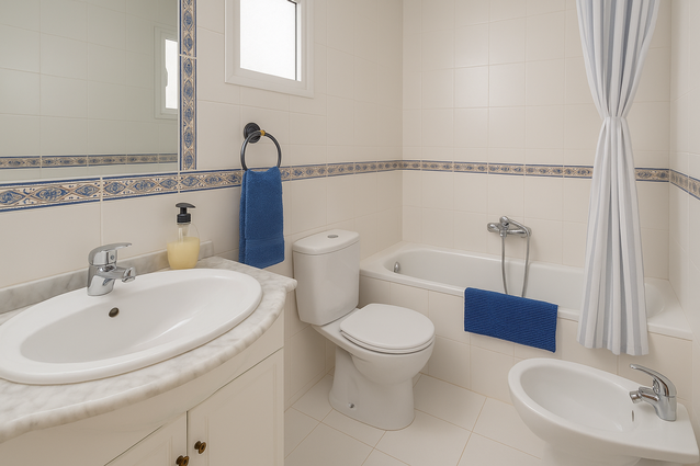 En la planta superior se encuentra el baño principal de la vivienda, cómodo y bien distribuido. Dispone de bañera, lavabo, inodoro, bidé y ventana al exterior, lo que garantiza una buena ventilación y entrada de luz natural.