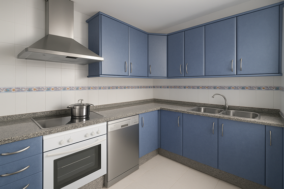 La cocina es independiente, luminosa y totalmente equipada. Cuenta con muebles altos y bajos en color azul con gran capacidad de almacenaje, encimeras de granito y todos los electrodomésticos esenciales: horno, vitrocerámica, campana extractora, lavavajillas y frigorífico combi.